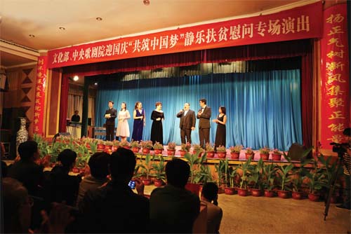 日前,文化部、中央歌劇院在靜樂縣舉辦了迎國慶“共筑中國夢”扶貧慰問專場演出。中央歌劇院的藝術(shù)家與當?shù)馗刹咳罕娡_獻藝,共同重溫紅色經(jīng)典,熱情謳歌黨的光輝業(yè)績。整場演出薈萃眾多藝術(shù)名家,演員們激情演唱了《我們走在大路上》《我為祖國獻石油》《打起手鼓唱起歌》《草原上升起不落的太陽》等膾炙人口的經(jīng)典老歌,引起了觀眾強烈的共鳴,現(xiàn)場掌聲、歡呼聲、叫好聲連綿不斷。演出不僅給當?shù)厝罕妿硪粓鼍始姵实奈幕⒀?,也激勵了干群齊心協(xié)力打好脫貧攻堅戰(zhàn)的斗志,增強了百姓實現(xiàn)全面脫貧、全面小康的信心和決心。(小敏 攝)