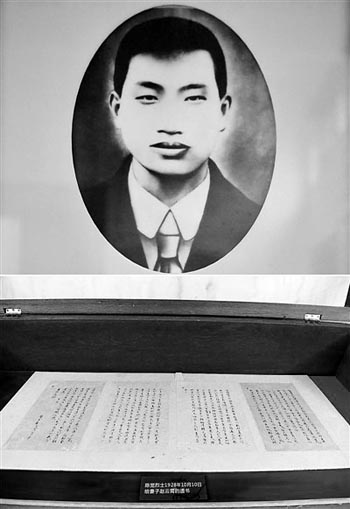 圖為拼版照片。上圖為陳覺像;下圖為湖南省長沙市烈士公園展出的陳覺烈士寫給妻子趙云霄的遺書(5月7日攝)。新華社發(fā)