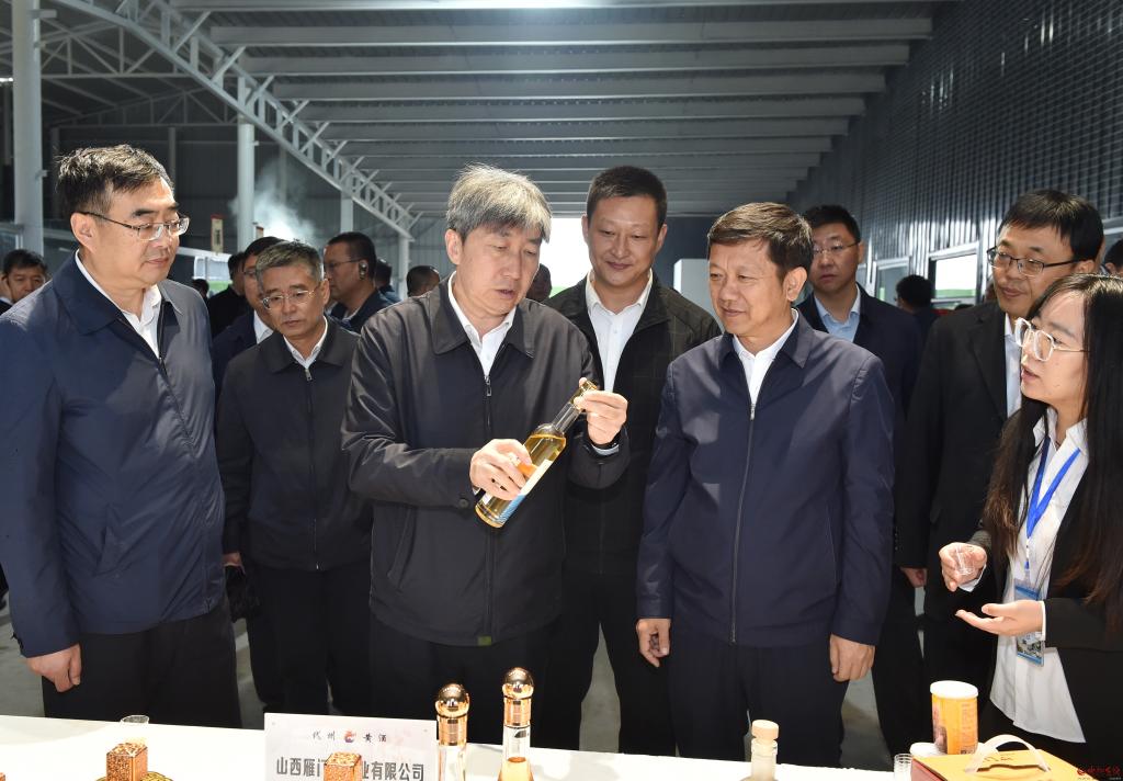 在山西雁門關酒業(yè)有限公司觀摩檢查年產(chǎn)1200噸清香型白酒、5000噸黃酒自動化生產(chǎn)線及古法釀酒項目建設情況。馮曉磊攝
