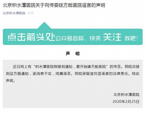 人民網(wǎng)北京2月25日電 據(jù)北京積水潭醫(yī)院官方微信公眾號消息,針對近日網(wǎng)上有“北京積水潭醫(yī)院剛接到通知,要開始建方艙醫(yī)院”的傳言,院方回應(yīng),沒接到這方面通知,該消息不實,純屬謠言。