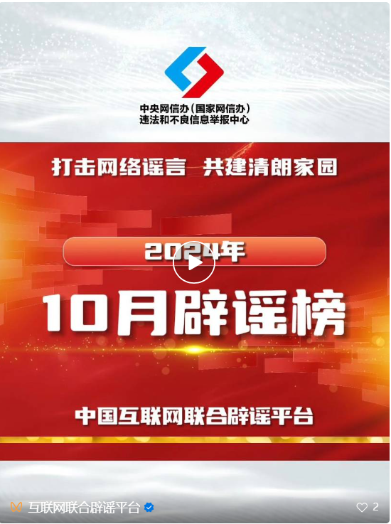 打擊網(wǎng)絡(luò)謠言 共建清朗家園 中國(guó)互聯(lián)網(wǎng)聯(lián)合辟謠平臺(tái)2024年10月辟謠榜