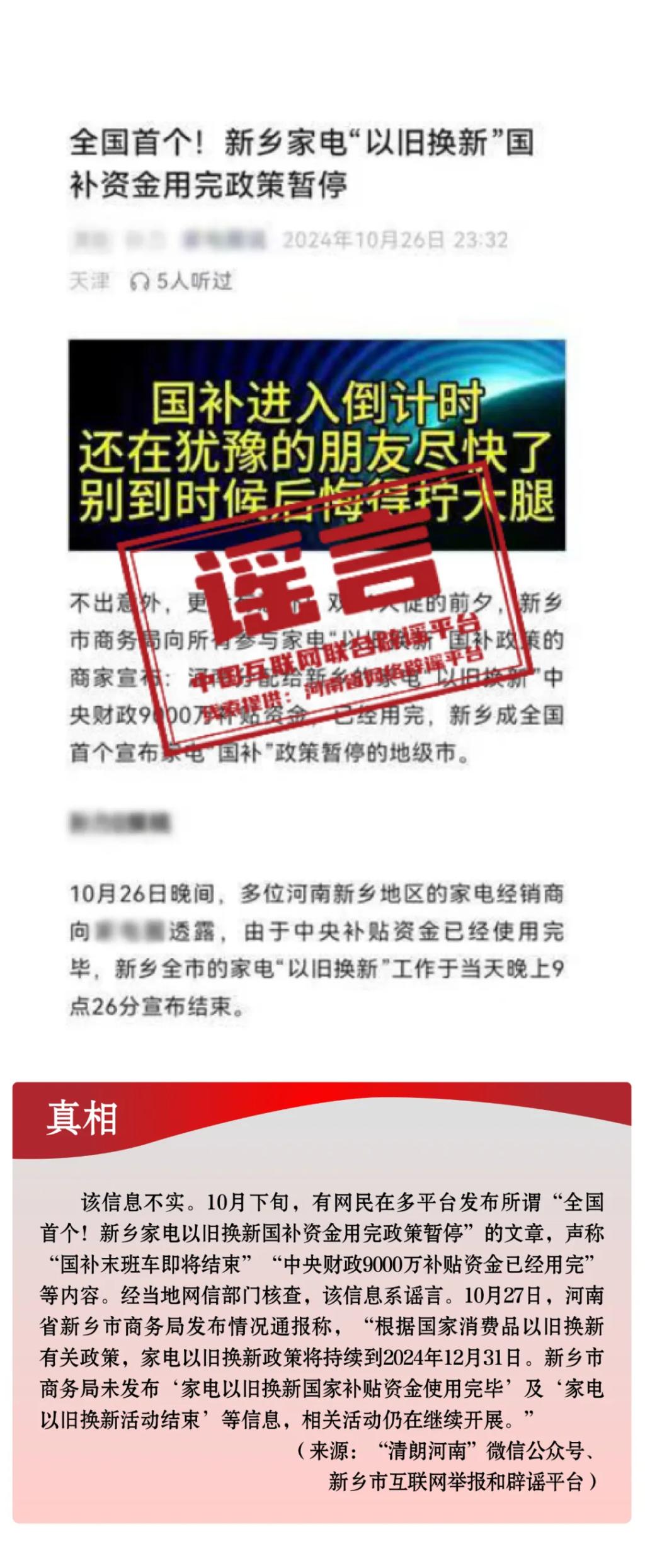河南新鄉(xiāng)家電“以舊換新”國(guó)家補(bǔ)貼資金用完、政策暫停?