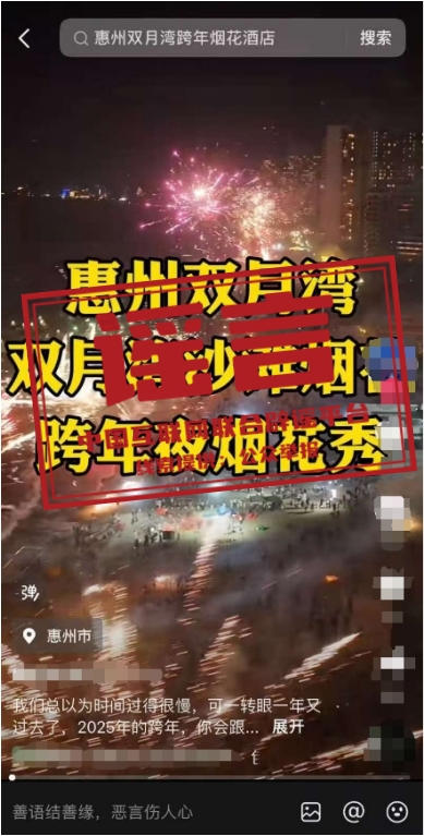 真相:近期,網(wǎng)絡(luò)上出現(xiàn) “廣東惠州雙月灣2025跨年煙花秀”“2025雙月灣跨年倒數(shù)夜”“雙月灣跨年煙花秀”等信息,引發(fā)關(guān)注。經(jīng)相關(guān)部門核實(shí),網(wǎng)傳信息均系不實(shí)信息。目前廣東省惠州市惠東縣雙月灣沒有舉辦2025年跨年煙花秀活動(dòng)的安排,請(qǐng)廣大游客不聽謠、不信謠、不傳謠,一切以官方發(fā)布信息為準(zhǔn)。(來源:“惠州日?qǐng)?bào)”微信公眾號(hào)、惠東文旅體)