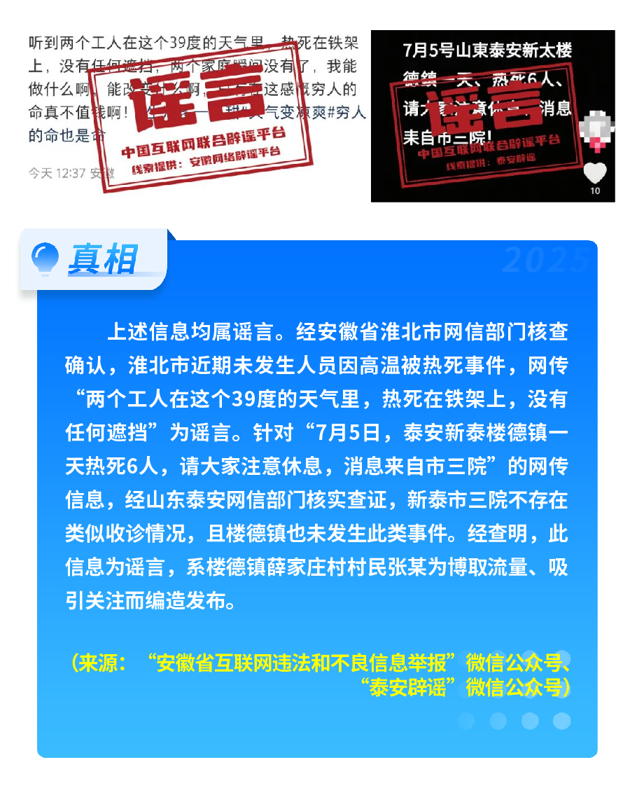 近期,網(wǎng)上接連出現(xiàn)發(fā)布虛假“警情通報”的惡性造謠傳謠案件,炮制傳播“昆明駕車撞人案131人死亡”“杭州自來水接入糞水”及涉釋永信虛假“警情通報”,模仿“藍(lán)底白字”格式,杜撰聳人聽聞細(xì)節(jié),損害政府公信力,嚴(yán)重擾亂社會秩序?!霸菏款A(yù)測廣東將發(fā)生8級以上大地震”公然偽造專家聊天截圖,謊報地震預(yù)警。還有造謠者借盛夏高溫酷暑與洪澇災(zāi)害,編造“安徽淮北、山東泰安等地多人因高溫死亡” “重慶大暴雨導(dǎo)致15人死亡、4人失蹤”等謠言,蹭炒熱點(diǎn)、煽動情緒。