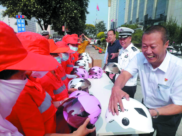 今年是我市創(chuàng)建全國文明城市的決戰(zhàn)決勝年,廣大環(huán)衛(wèi)工人一直默默奮斗在崗位上,為我市創(chuàng)文不斷努力。市公安局交警支隊始終牽掛著奮戰(zhàn)在基層一線的環(huán)衛(wèi)工人,支隊以此次贈送頭盔活動為契機,持續(xù)關(guān)心關(guān)愛環(huán)衛(wèi)工人的生命安全和身體健康。市公安局交警支隊負責(zé)人表示:“環(huán)衛(wèi)工人大多騎著電動三輪車或人力保潔車穿梭在大街小巷,機動車道是他們的主要作業(yè)區(qū)之一,佩戴安全頭盔,可以大大增加他們的安全系數(shù)。同時,環(huán)衛(wèi)等重點行業(yè)的示范引領(lǐng)作用,將有力帶動市民遵紀守法、安全出行,為文明城市創(chuàng)建打造一道亮麗的風(fēng)景線?!眻D為捐贈活動現(xiàn)場。張志遠 攝影報道