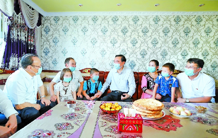 日前,自治區(qū)黨委書記陳全國,自治區(qū)黨委副書記、自治區(qū)主席雪克來提·扎克爾在克孜勒蘇柯爾克孜自治州調(diào)研統(tǒng)籌推進常態(tài)化疫情防控和經(jīng)濟社會發(fā)展工作。這是陳全國、雪克來提·扎克爾在阿克陶縣絲路佳苑易地扶貧搬遷安置點,走進建檔立卡貧困戶穆拉提·艾海提家中,關(guān)心詢問搬遷后的生活情況,勉勵他們持續(xù)增收致富,把日子越過越好。 崔志堅攝