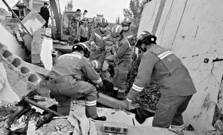 由于路途遙遠(yuǎn),3時30分,先期救援力量2車8人到達(dá)事故現(xiàn)場。經(jīng)現(xiàn)場偵查和詢問知情人得知:坍塌房屋為一棟磚木結(jié)構(gòu),房頂為預(yù)制板,房屋坍塌現(xiàn)場一片狼藉,面積約50平方米的空間內(nèi),土塊、瓦礫、預(yù)制板、家具雜亂無章。3人被埋在廢墟下,且房屋的墻體發(fā)生大角度傾斜并伴有多處裂縫,隨時都有再次倒塌的危險。由于現(xiàn)場作業(yè)面有限,不能使用機械設(shè)備,廢墟下面還有被埋人員,救援動作不能太大,給消防救援帶來很大困難。