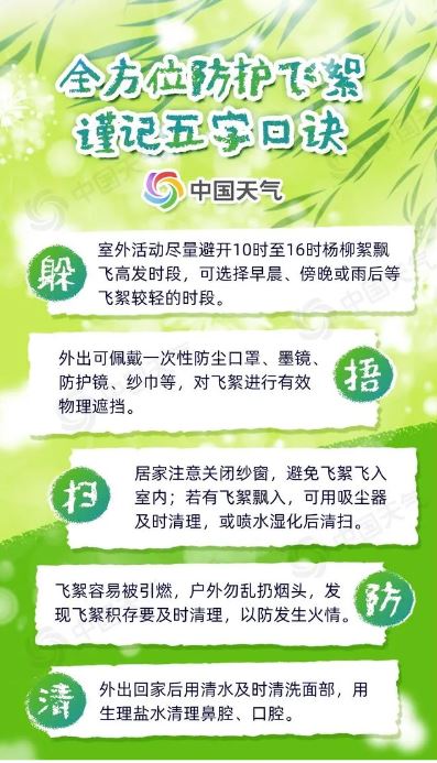 隨風(fēng)飄散的飛絮可能會(huì)攜帶花粉、粉塵等物質(zhì)入侵人體呼吸道,引發(fā)皮膚或呼吸系統(tǒng)的過敏癥狀,且楊柳絮屬于易燃物,遇到明火會(huì)迅速燃燒蔓延,甚至引燃其他可燃物,釀成火災(zāi)。記住五字口訣,全方位防護(hù)擾人的“四月雪”。