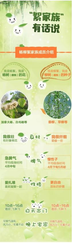 以華北地區(qū)最早開始飄絮的白毛楊為例,當(dāng)日平均氣溫大于0℃時(shí),白毛楊才能正常生長發(fā)育,將這些超過0℃的數(shù)值累加起來,當(dāng)總和達(dá)到480℃,且日平均氣溫達(dá)到14℃,楊絮就開始飄飛。華北一帶,往往4月上旬前后達(dá)到這一標(biāo)準(zhǔn)。楊絮飄飛10余天后,柳絮也會(huì)進(jìn)入飄飛期。