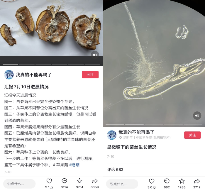 拿到樣本后,許博士對蘋果做了切片觀察,還在抖音上向網(wǎng)友實(shí)時更新起了菌絲生長情況,引發(fā)越來越多網(wǎng)友的“追更”。之后又有科普創(chuàng)作者@植物眼 專門采訪許博士的導(dǎo)師趙琪,他的細(xì)致講解讓很多網(wǎng)友紛紛表示“又學(xué)到了新知識”。