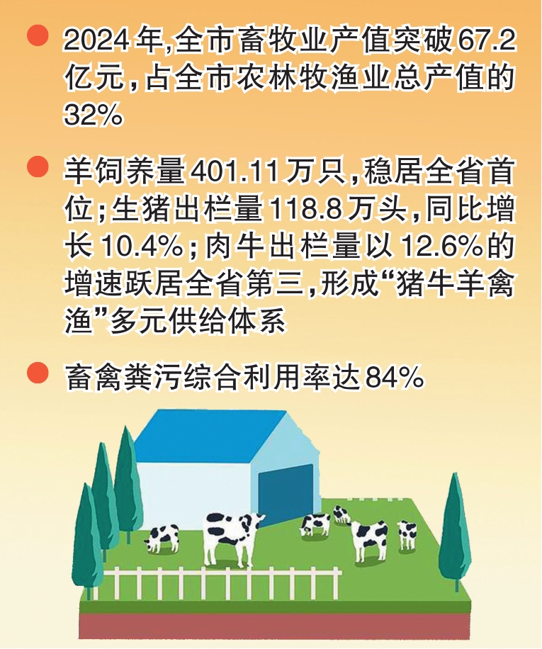 2024年,我市畜牧業(yè)產(chǎn)值突破67.2億元,占全市農(nóng)林牧漁業(yè)總產(chǎn)值的32%;羊飼養(yǎng)量以401.11萬(wàn)只的規(guī)模穩(wěn)居山西省首位;畜禽糞污綜合利用率達(dá)84%……一組組數(shù)據(jù)背后,正是這座北方畜牧強(qiáng)市以“穩(wěn)產(chǎn)保供”筑牢產(chǎn)業(yè)基底、以“全鏈升級(jí)”助力鄉(xiāng)村振興的生動(dòng)實(shí)踐。