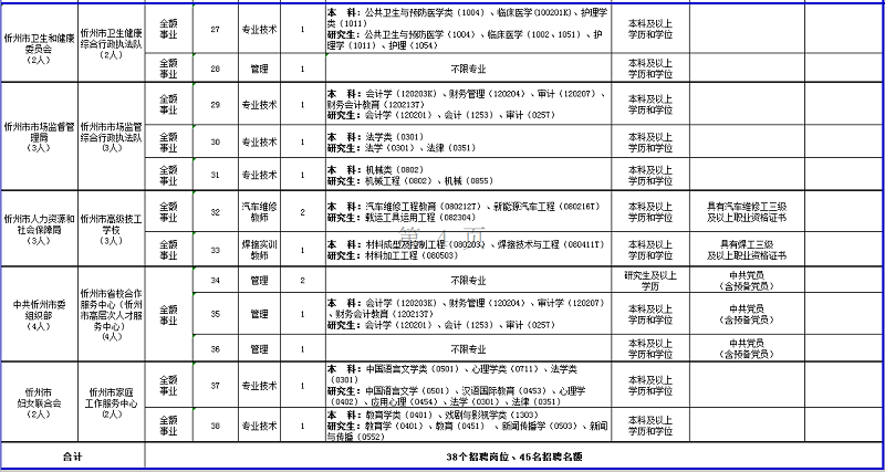 為進(jìn)一步加強(qiáng)事業(yè)單位工作人員隊(duì)伍建設(shè),按照《事業(yè)單位人事管理?xiàng)l例》和山西省委組織部、山西省人社廳《關(guān)于進(jìn)一步改進(jìn)和加強(qiáng)事業(yè)單位公開(kāi)招聘工作的意見(jiàn)》(晉人社廳發(fā)〔2017〕35號(hào))、《關(guān)于做好2022年全省事業(yè)單位公開(kāi)招聘工作的通知》(晉人社廳發(fā)〔2022〕30號(hào))等文件規(guī)定和要求,根據(jù)增人計(jì)劃和招聘單位編制、崗位空缺情況,經(jīng)市委、市政府研究決定,為忻州市人大常委會(huì)辦公室法律研究中心等14個(gè)事業(yè)單位公開(kāi)招聘工作人員45名?,F(xiàn)公告如下: