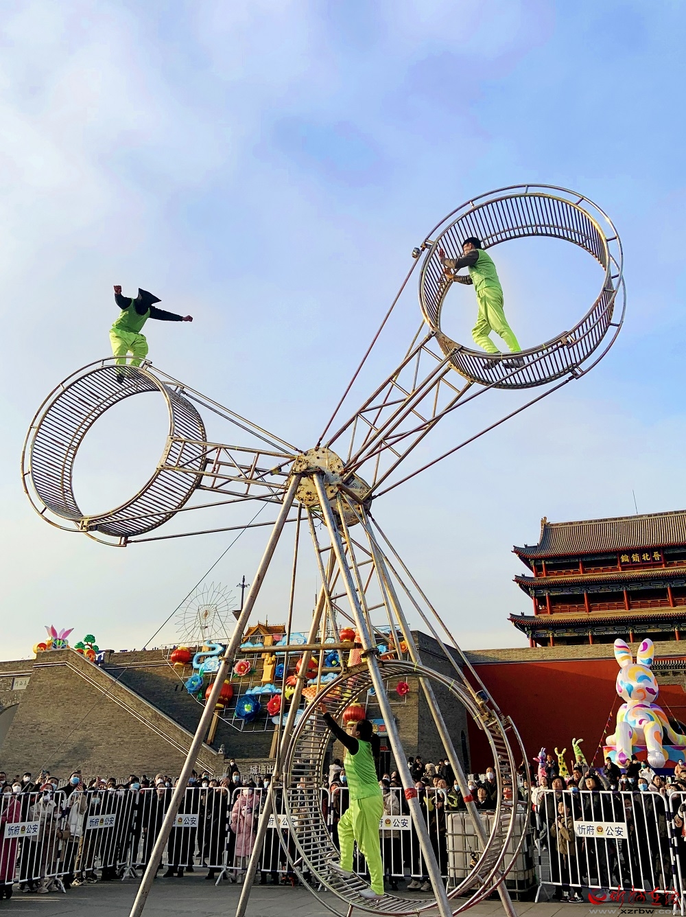 剛進入北廣場就可以看到10余米高的大飛輪,其中包含3個獨立的金屬轉(zhuǎn)輪,由古城的三位工作人員各占一個,來回旋轉(zhuǎn)騰挪,期間演員們在轉(zhuǎn)輪里行走、奔跑,做各種奇異的高難度動作,甚至翻到轉(zhuǎn)輪外側(cè)在轉(zhuǎn)輪上花式跳繩、戴頭套摸瞎兒,他們身穿亮眼的熒光綠表演服,與金屬轉(zhuǎn)輪上的各色燈帶交相呼應(yīng)燦爛奪目,節(jié)目持續(xù)15分鐘的驚險刺激,贏得在場觀眾連連稱贊。