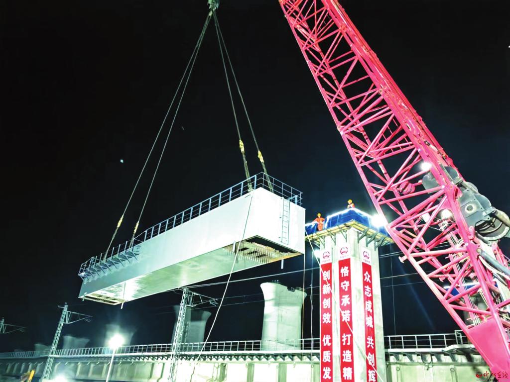 6月13日晚,伴隨著履帶吊車的陣陣轟鳴,經(jīng)過起吊、停穩(wěn)、轉(zhuǎn)向、橫移、落梁近160分鐘的緊張作業(yè),由中鐵上海工程局承建的集大原鐵路山西段站前4標(biāo)樊家莊跨韓原鐵路特大橋最后一榀鋼橫梁穩(wěn)穩(wěn)地落在575#門式墩上。至此,集大原鐵路4標(biāo)段內(nèi)572#—575#四榀鋼橫梁全部順利吊裝完成,為后續(xù)箱梁架設(shè)、橋面附屬工程施工、連續(xù)梁轉(zhuǎn)體施工等控制性工程的有力推進奠定了堅實基礎(chǔ)。