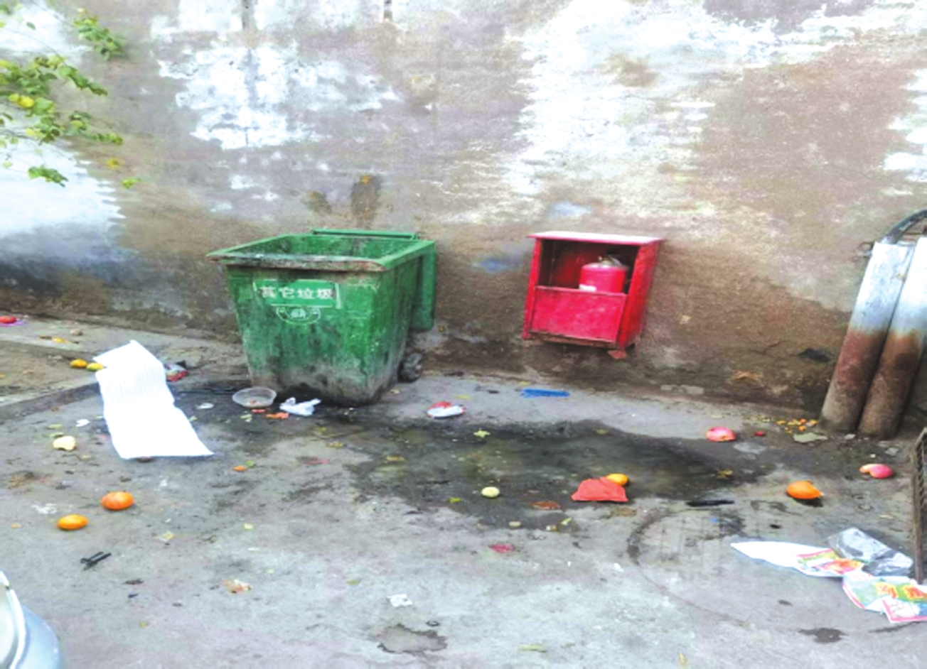 忻府區(qū)和平東街農(nóng)貿(mào)市場(chǎng)垃圾箱臟亂、消防器材缺失。
