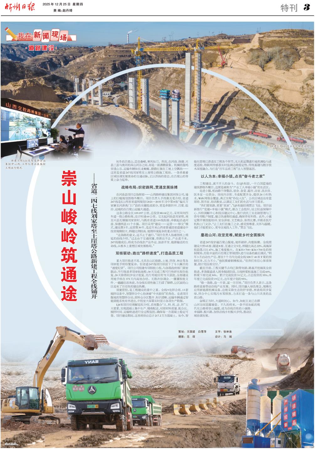 初冬的呂梁山,層巒疊嶂,寒風(fēng)如刀。然而,在河曲、保德、興縣三縣與黃河的深山河谷之間,卻是一派沸騰景象。機(jī)械的轟鳴穿透山谷,運(yùn)輸車(chē)輛如長(zhǎng)龍蜿蜒,獵獵紅旗在工地上空飄揚(yáng)——這里是省道247線劉家塔至土崖塔公路施工現(xiàn)場(chǎng)。一條承載著區(qū)域協(xié)調(diào)發(fā)展使命的交通動(dòng)脈,正以昂揚(yáng)的姿態(tài),在呂梁山的脊梁上奮力延伸。