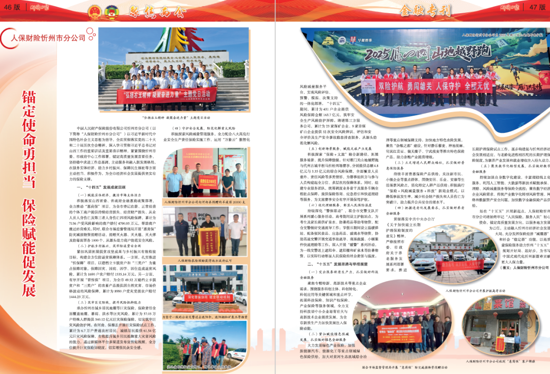 中國人民財產(chǎn)保險股份有限公司忻州市分公司(以下簡稱“人保財險忻州市分公司”)以習(xí)近平新時代中國特色社會主義思想為指導(dǎo),全面貫徹落實黨的二十大和二十屆歷次全會精神,深入學(xué)習(xí)貫徹習(xí)近平總書記對山西工作的重要講話及重要指示精神,緊緊圍繞忻州市委、市政府中心工作部署,錨定高質(zhì)量發(fā)展首要任務(wù),堅持穩(wěn)中求進工作總基調(diào),主動服務(wù)和融入新發(fā)展格局,在服務(wù)實體經(jīng)濟、助力鄉(xiāng)村振興、保障民生福祉等方面主動擔(dān)當、積極作為,為全市經(jīng)濟社會發(fā)展提供堅實有力的保險支撐。