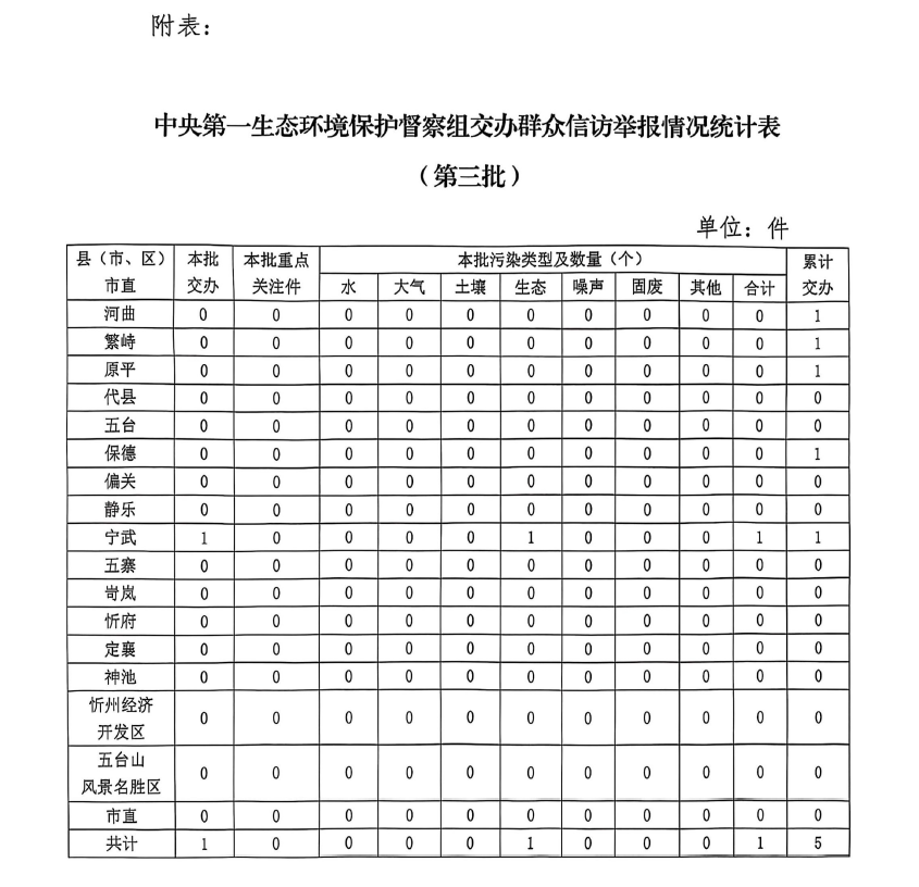 截止5月31日,中央第一生態(tài)環(huán)境保護督察組累計向我市交辦信訪件5件,其中重點關(guān)注件0件。交辦的信訪件中,涉及原平市1件、河曲縣1件、繁峙縣1件、保德縣1件、寧武縣1件;涉及生態(tài)環(huán)境問題5個,其中水污染問題1個、大氣污染問題1個、生態(tài)破壞問題2個、噪聲污染問題1個。