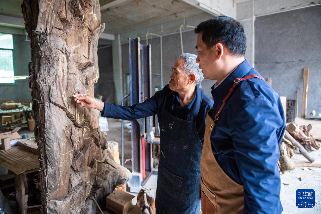 5月23日,在洞口縣巖山鎮(zhèn)陽家山村,傅立先(左)和父親傅金林在挑選木雕材料。