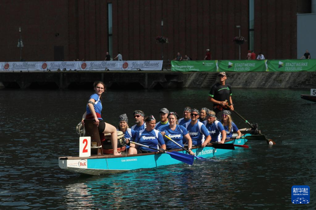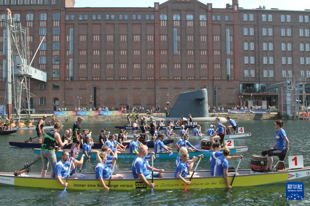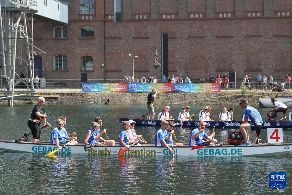 6月10日,人們?cè)诘聡?guó)杜伊斯堡參加趣味龍舟賽。新華社記者 單瑋怡 攝