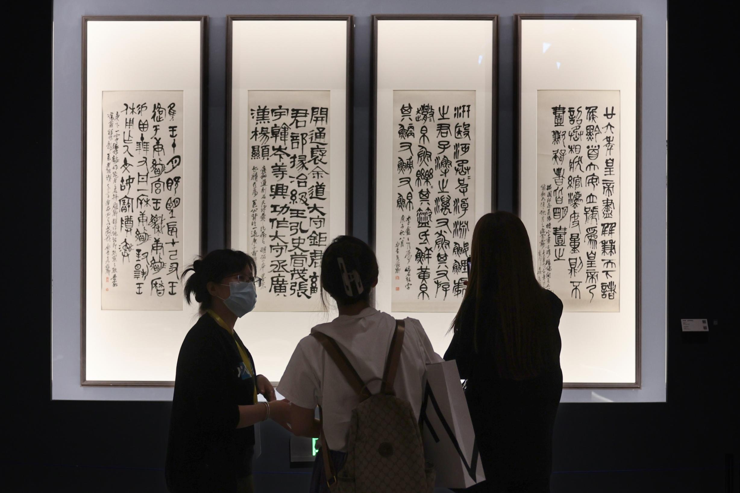 北京民生現(xiàn)代美術(shù)館副館長、民生書法藝術(shù)館副館長陳鴻毅介紹,該展緣起于中國民生銀行獨(dú)家贊助的大型系列人物傳記紀(jì)錄片《百年巨匠》。在策展過程中,展覽用中國傳統(tǒng)經(jīng)典名著《左傳》《論語》《史記》中的話語體系作為展覽的主框架,體現(xiàn)中華文明傳承之深遠(yuǎn),如“益者三友”部分展出了與松、竹、梅相關(guān)的作品,“白魚赤烏”部分則呈現(xiàn)了有關(guān)動物與瑞獸的作品。