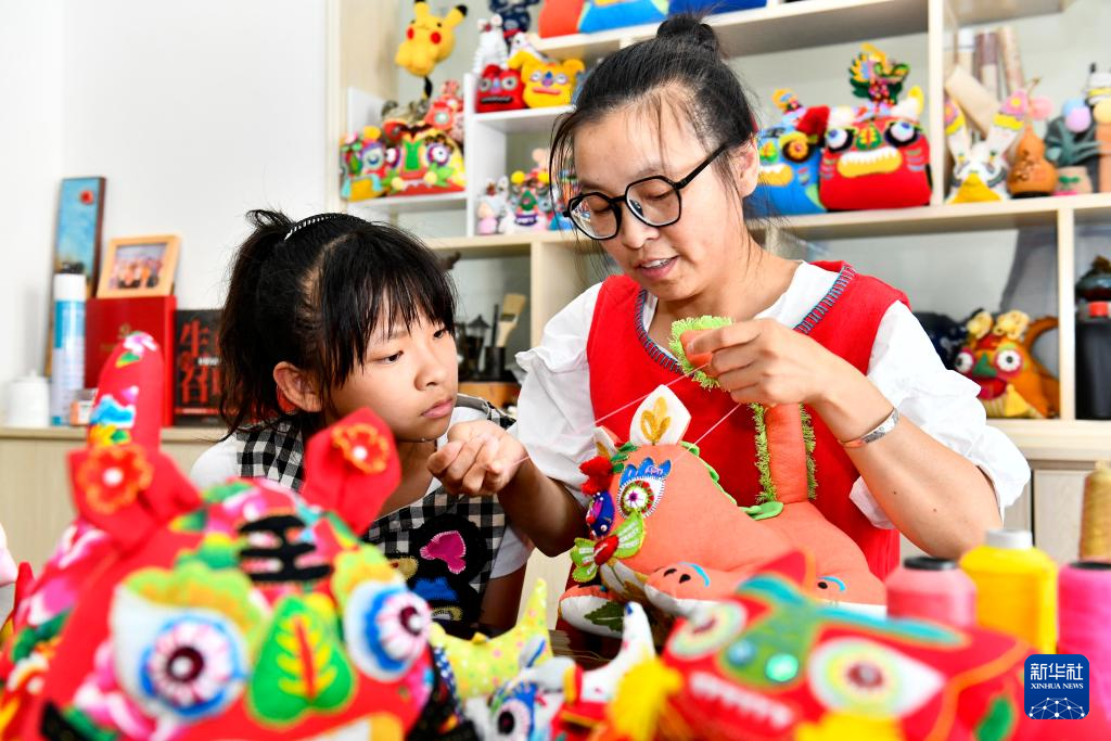 7月19日,在威海市文登區(qū)孫曉麗布玩具非遺工作室,非遺傳承人孫曉麗教女兒布老虎制作技藝。