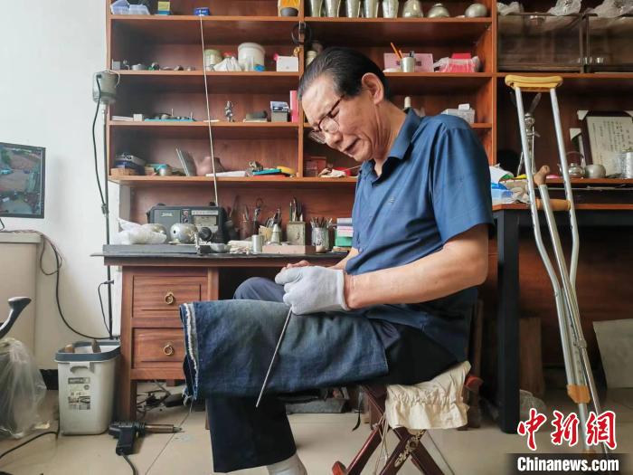 王圣良告訴記者,小時(shí)候他因?yàn)樯?,腿腳落下了殘疾,別的兄弟姐妹出去玩,他就跟著爺爺學(xué)習(xí)錫雕。“做錫雕需要心靜、身靜,因?yàn)樾凶卟环奖悖冶绕渌烁米?,在學(xué)習(xí)錫雕上更有‘優(yōu)勢’”。