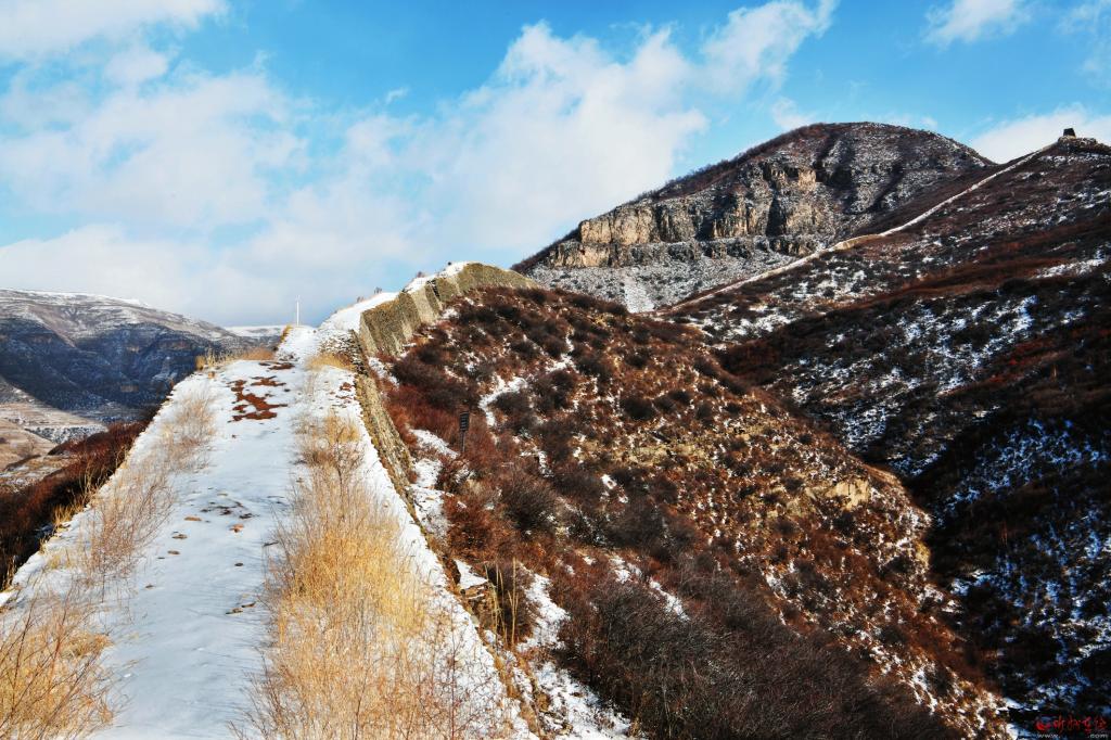 另一道長城是這樣的:史書上記載的宋長城出發(fā)地是草城川口天澗堡,實(shí)地中的草城川現(xiàn)在叫北川河,天澗堡古代可能有堡墻,如沒有,不可能有“川口有古城”的記載,可能歷經(jīng)千余年風(fēng)雨被河水沖刷掉了,現(xiàn)在堡墻已不太明顯但有古文化層遺跡,還有兩座規(guī)模較大的烽火臺(tái)。長城從此出發(fā),向東爬上陡坡,順著一道山洼上到山頂。在山頂走了一公里余就與從興縣西來的北齊、隋修筑的早期長城匯合,在陡峭的山頂上形成一個(gè)完美的“岢嵐結(jié)”,也就是俗話中的“二把叉”形狀。這段宋代獨(dú)立修筑的長城大約有3公里。