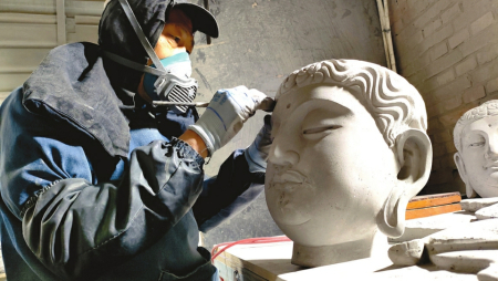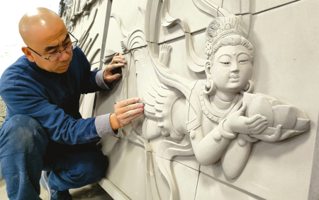 11月22日,晉中市太谷區(qū)晉派磚雕研究所,省級非遺項目晉派磚雕代表性傳承人溫建明正在為《飛天》磚雕作品進(jìn)行最后的創(chuàng)作。