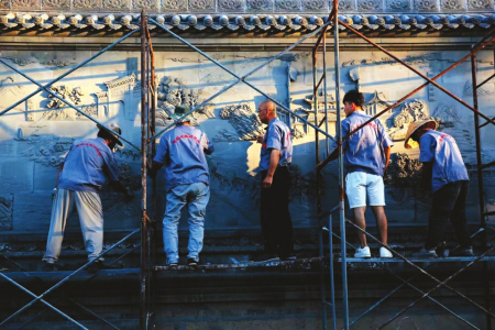 溫建明帶領(lǐng)團(tuán)隊為榆次什貼古鎮(zhèn)創(chuàng)作160米的《晉商萬里茶道》大型磚雕文化墻。