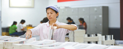安徽省涇縣三希堂線(xiàn)裝文化園,工人正在原大影印摛藻堂本《欽定四庫(kù)全書(shū)薈要》生產(chǎn)線(xiàn)上忙碌。