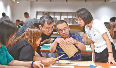 山西省圖書(shū)館,來(lái)自國(guó)家圖書(shū)館的古籍修復(fù)專(zhuān)家劉建明(右二)在給該省第一期古籍修復(fù)培訓(xùn)班的學(xué)員們講解古籍修復(fù)技巧。