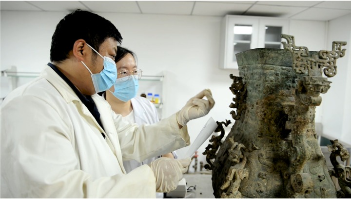 2019年,時(shí)值河南博物院開(kāi)展抗震加固工程,所有展品都搬進(jìn)了庫(kù)房,蓮鶴方壺也迎來(lái)了一次更加全面的修復(fù):編制修復(fù)方案、用新材料對(duì)底座進(jìn)行支撐和加固、用X光片探傷并采集內(nèi)部構(gòu)造信息、進(jìn)行三維數(shù)據(jù)掃描和數(shù)字化保護(hù)……