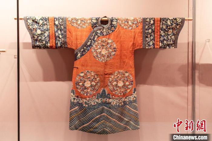 “這件吉服袍是清代滿漢服飾文化交融的重要見證:滿族作為北方游牧民族,為適應騎射之需,其傳統(tǒng)袍服多為‘緊身窄袖’樣式,清代中后期,受到漢族女裝寬身博袖造型影響,滿族宮廷女性吉服袍的袖筒及馬蹄袖口變得更加肥闊。”田輝說。