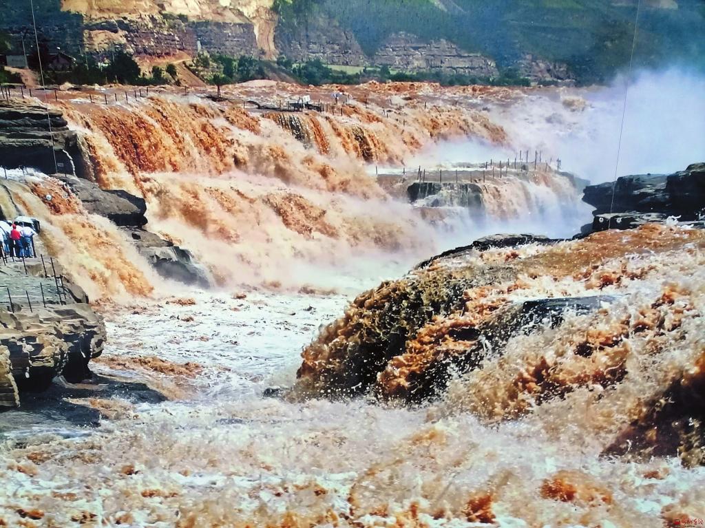 次日一大早,我獨(dú)自沿著黃河岸邊山西吉縣段向北行走,邊鍛煉身體邊觀瀑。黃河奔流至此,石壁峭立,河口收縮如壺口,故名。河面壓縮到二三十米,每秒一千立方米的河水,從二十多米高的陡崖上傾注而瀉,形成“千里黃河一壺收”的壯美景象。壺口瀑布是國(guó)家5A級(jí)風(fēng)景名勝區(qū),東瀕山西省吉縣壺口鎮(zhèn),西臨陜西省宜川縣壺口鎮(zhèn),為兩省共有的旅游景區(qū)。一瀑布連二省,同名同鎮(zhèn),秦晉之好,傳為佳話。