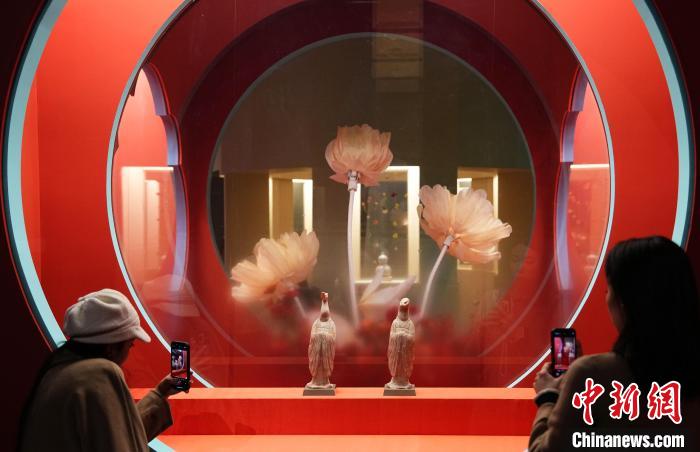 據(jù)介紹,這是蛇類紋飾作為裝飾題材出現(xiàn)在商周青銅禮器之上的一種典型代表。半人半蛇的唐代“伏羲女媧像立幅”帛畫,印證著伏羲女媧這一久遠的文化信仰,通過絹帛畫形式在當時的吐魯番地區(qū)傳播,并吸引其他民族的崇奉。此外,展廳中充滿新春氛圍感的桃花洞釉燈籠瓶、白玉“天官賜?!迸濉ⅰ昂镁啤卑子员P等近200余件(套)館藏文物精品,書寫著對即將到來的蛇年新春的期待和祝福。