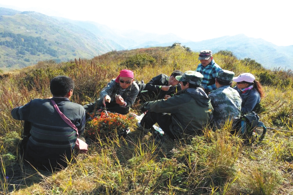 再向前,是一片更茂密的荊棘林,坡度更陡了,大家顧不得叢林中有刺,相互攙扶著向前走。上面是刺人的荊棘,下面是萬丈深淵,腳下的草有點濕滑,一旦踩空,可能粉身碎骨。羊倌一直提醒注意腳下,踩實了再邁步,真是心驚膽戰(zhàn)。幸好前面出現了一處空地,大伙得以小憩,喝點水,補充一下體能。有三人主動放棄登頂,大伙商議后,剩余十人決定繼續(xù)前進,完成登頂夙愿。三人原地守候,等大伙返回后會合。