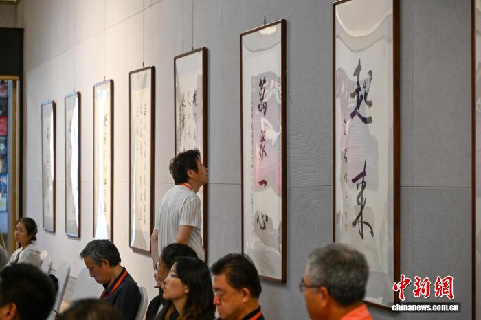 參觀者觀看前進的號角——《聶耳音樂作品》勞偉專題書法展作品。李嘉嫻 攝