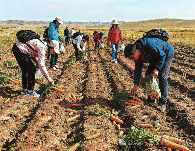 “撿秋”游演繹著“鄉(xiāng)土中國”的現(xiàn)代篇章。費孝通在《鄉(xiāng)土中國》開篇即言“從基層上看去,中國社會是鄉(xiāng)土性的”。這種“鄉(xiāng)土性”的核心是人與土地的深度綁定。農(nóng)民靠土地生存,土地是文化認(rèn)同的根基?!皳烨铩边@種農(nóng)耕活動,如今以更加鮮活方式延續(xù)下來。對農(nóng)民而言,土地不僅是謀生手段,更是安身立命的“精神原鄉(xiāng)”。而城市游客的參與則賦予了“撿秋”新的意義。在城市里待久了,就想蹲在田里感受泥土的溫度,游客“撿秋”體驗的是“春種秋收”踏實感。這種體驗式參與是現(xiàn)代人對鄉(xiāng)土文明的“情感反哺”。游客們彎腰的身影既是對土地的致敬,也是對“根”的追尋。他們未必真懂農(nóng)事,但通過參與“撿秋”完成了對鄉(xiāng)土文化的認(rèn)同,被撿起的“果實”從“生存作物”演變?yōu)椤拔幕浇椤?。?dāng)前,內(nèi)蒙古各地推出的挖土豆、烤土豆等旅游項目是對鄉(xiāng)土資源的文化再“編碼”,當(dāng)土豆從田間走向游客的后備箱,“鄉(xiāng)土中國”便獲得了更加豐富的表達。