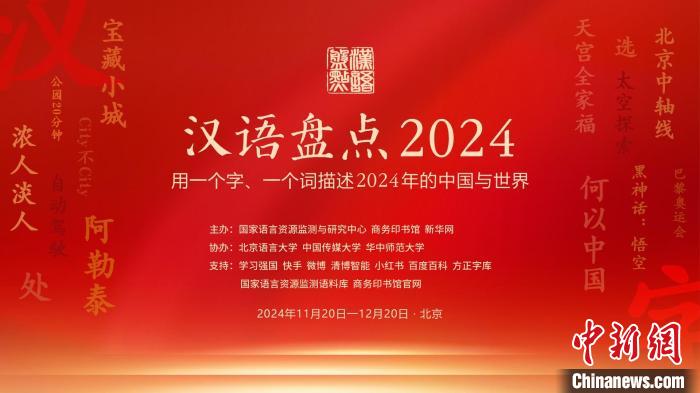 由國(guó)家語(yǔ)言資源監(jiān)測(cè)與研究中心、商務(wù)印書館等聯(lián)合主辦的“漢語(yǔ)盤點(diǎn)2024”20日在京啟動(dòng),“用一個(gè)字、一個(gè)詞描述當(dāng)年的中國(guó)與世界”,鼓勵(lì)全民用語(yǔ)言記錄生活,描述中國(guó)視野下的社會(huì)變遷和世界萬象。