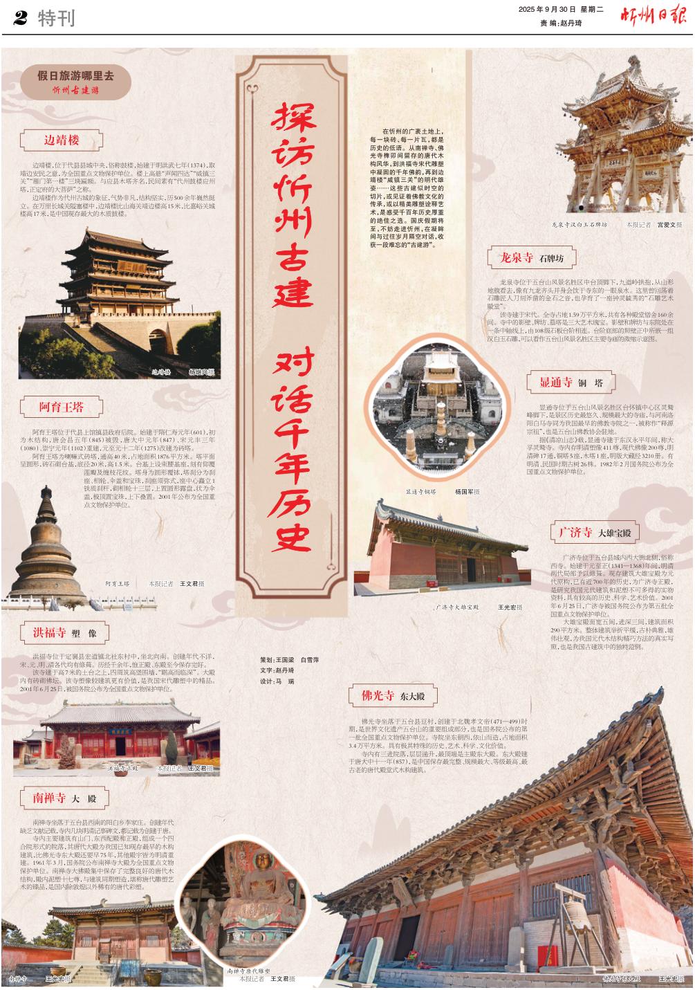 在忻州的廣袤土地上,每一塊磚、每一片瓦,都是歷史的低語(yǔ)。從南禪寺、佛光寺榫卯間留存的唐代木構(gòu)風(fēng)華,到洪福寺宋代雕塑中凝固的千年佛韻,再到邊靖樓“威鎮(zhèn)三關(guān)”的明代雄姿……這些古建似時(shí)空的切片,或見(jiàn)證著佛教文化的傳承,或以精美雕塑詮釋藝術(shù),是感受千百年歷史厚重的絕佳之選。國(guó)慶假期將至,不妨走進(jìn)忻州,在凝眸間與過(guò)往歲月隔空對(duì)話,收獲一段難忘的“古建游”。