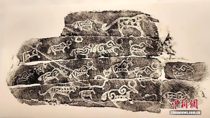 記者在展覽現(xiàn)場看到,牦牛、獵手、獵犬、牽引車輛等高原特色元素躍然紙上,既清晰還原了巖畫粗獷古樸的原始質(zhì)感,也直觀勾勒出先民的狩獵生活圖景。