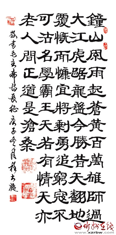 二是程老有真功。他一人能熟練書寫甲骨、篆書、魏碑、曹全隸、乙瑛隸、章草、歐柳楷、顏趙楷、行楷、行書、行草、草書、伊秉綬隸、創(chuàng)新粗圓、創(chuàng)新仿宋、創(chuàng)新大黑、創(chuàng)新角篆、仿毛體18種書體(見圖)。還會畫畫寫詩,詩書畫樣樣精通。對程大凝而言,臨帖是他最大的快樂,創(chuàng)作是他最大的滿足?,F在他的工作室有4000多幅作品。退休后參加全國性書法大賽就獲獎300余次。