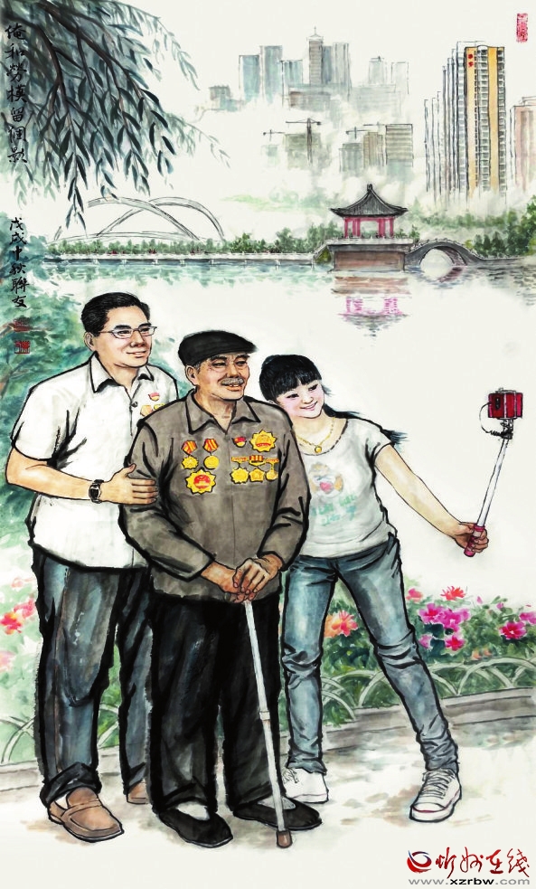 游園巧遇老勞模,一片徽章耀眼珠。