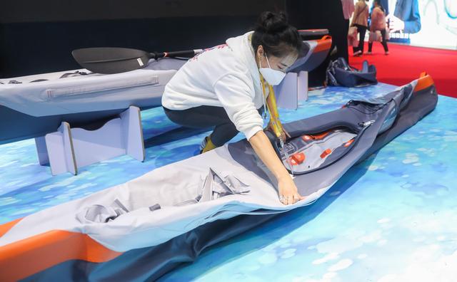 11月6日,工作人員在進博會消費品展區(qū)的迪卡儂展臺演示可折疊皮劃艇如何安裝。新華社記者 丁汀 攝