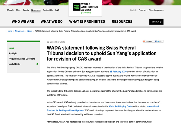 在得知瑞士最高法院撤銷對(duì)孫楊的裁決后,WADA對(duì)此事發(fā)表聲明稱,已得知瑞士聯(lián)邦最高法院支持孫楊對(duì)CAS判決的改判請(qǐng)求,會(huì)積極采取行動(dòng),在案件回到國(guó)際體育仲裁法庭后,繼續(xù)陳述其立場(chǎng)。聲明如下: