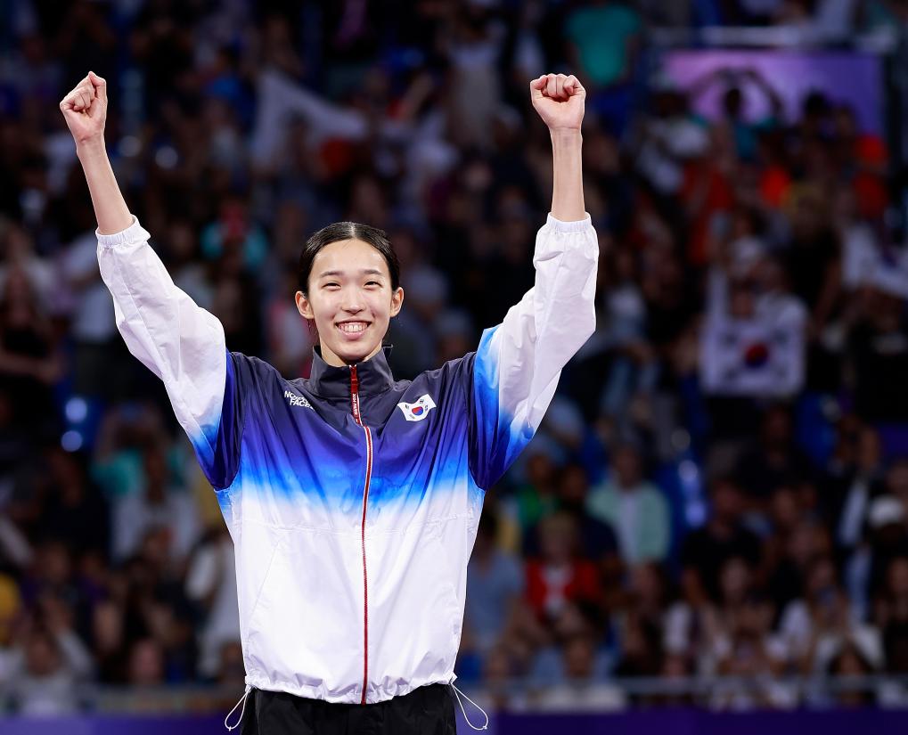 2024年8月8日,獲得冠軍的韓國選手金宥珍在巴黎奧運(yùn)會跆拳道女子57公斤級決賽頒獎儀式上。新華社記者 費(fèi)茂華 攝