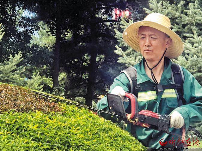 城市是我家,我來(lái)扮美它。市園林服務(wù)中心體育廣場(chǎng)管理辦公室張立文正在精心修剪綠植。本報(bào)記者 范 濤 攝
