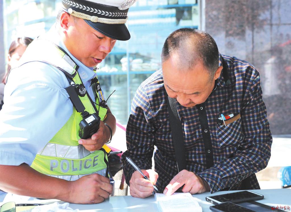 志愿者為過往群眾發(fā)放創(chuàng)文宣傳資料 本報通訊員 攝