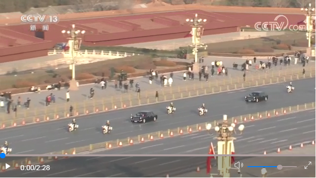 天安門(mén)廣場(chǎng)鳴放21響禮炮,禮兵列隊(duì)致敬,迎賓小號(hào)手鳴禮號(hào)。兩國(guó)元首登上檢閱臺(tái),軍樂(lè)團(tuán)奏中菲兩國(guó)國(guó)歌。馬科斯在習(xí)近平陪同下檢閱了中國(guó)人民解放軍儀仗隊(duì),并觀看分列式。